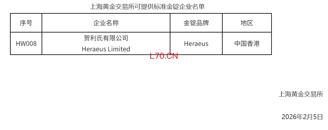 上海黄金交易所:新增贺利氏有限公司为境外可提供标准金锭企业