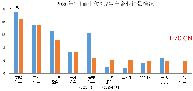 中汽协:1月销量排名前十位的SUV生产企业共销售73.4万辆