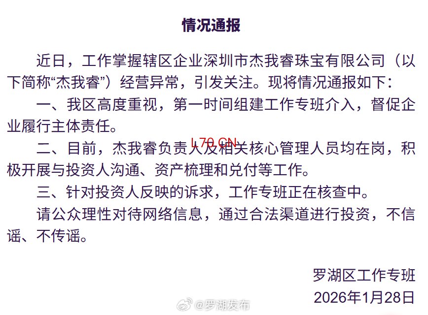 深圳一珠宝公司被曝经营异常?罗湖通报:工作专班正在核查中