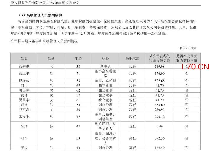天齐锂业董事长蒋安琪2025年税前报酬总额为519.08万元,较2024年的358.78万元,涨幅为44.68%。