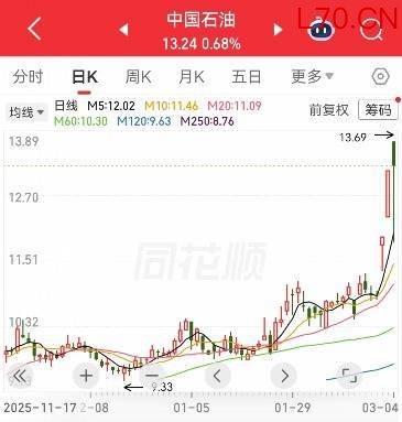 在连续两天涨停之后,3月4日,中国石油高开低走,经受住获利资金大举卖出之后,中国石油顽强翻红,并在尾盘一度上涨近4%,截至收盘上涨0.68%,股价报13.24元/股,创2008年以来新高,A股市值达到2.14万亿元。