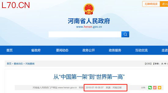 而力场君则在河南省人民政府网站看到一份《河南日报》于2018年7月发表的报道,标题为《从“中国第一架”到“世界第一高”》,其中有这样一句: