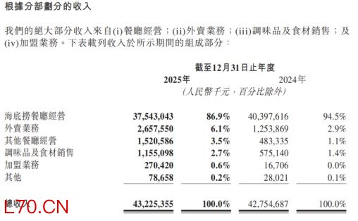 值得注意的是,海底捞的核心板块餐厅经营业务出现增长瓶颈。财报显示,海底捞餐厅经营收入从2024年的403.98亿元降至375.43亿元,同比减少7.1%,占总营收比重也从94.5%收缩至86.9%。