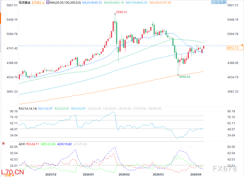 (现货黄金日图 来源:易汇通)技术面上,黄金仍处于清晰的区间整理格局。现货黄金目前被牢牢夹在50日均线(约4902美元)和100日均线(约4694美元)之间。相对强弱指数(RSI)处于50附近的中性水平,平均方向指数(ADX)接近11,显示趋势强度正在减弱而非强化。