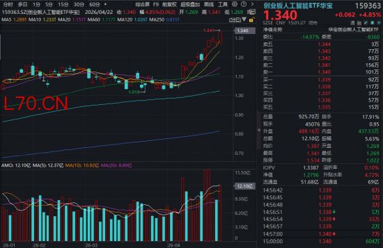 热门ETF方面,重仓光模块CPO龙头的创业板人工智能ETF华宝(159363)午后单边猛攻,收涨4.85%继续新高,单日爆量成交超12亿元,资金此前四日累计加码超2.3亿元!