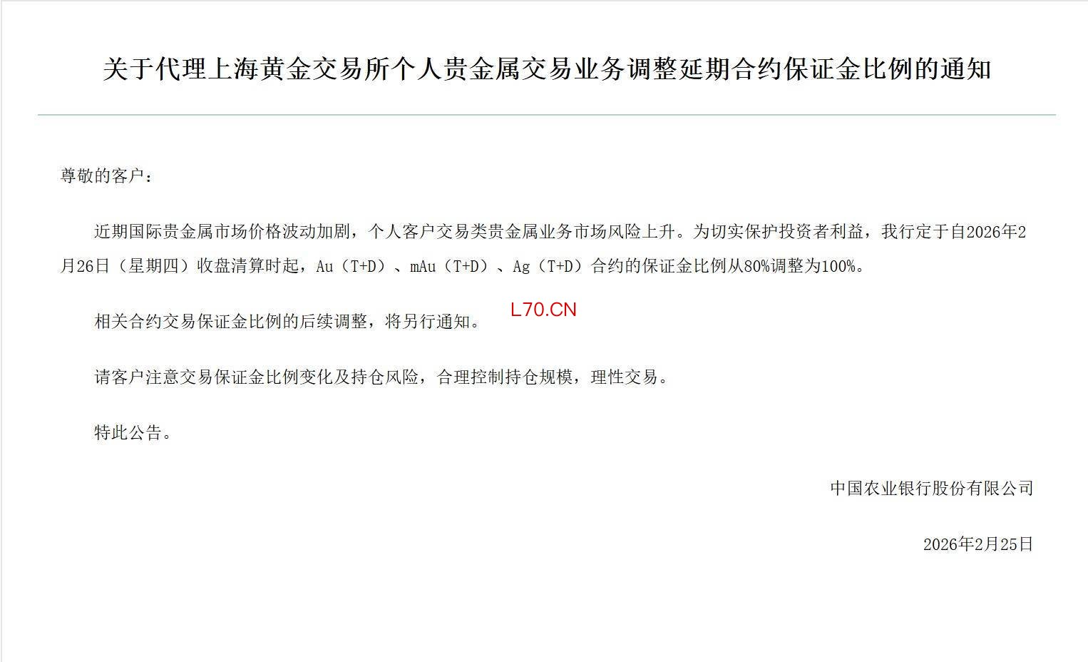 “近期国际贵金属市场价格波动加剧,个人客户交易类贵金属业务市场风险上升。”2月25日,中国农业银行发布通知称,为切实保护投资者利益,该行定于自2026年2月26日收盘清算时起,Au(T+D)、mAu(T+D)、Ag(T+D)合约的保证金比例从80%调整为100%。