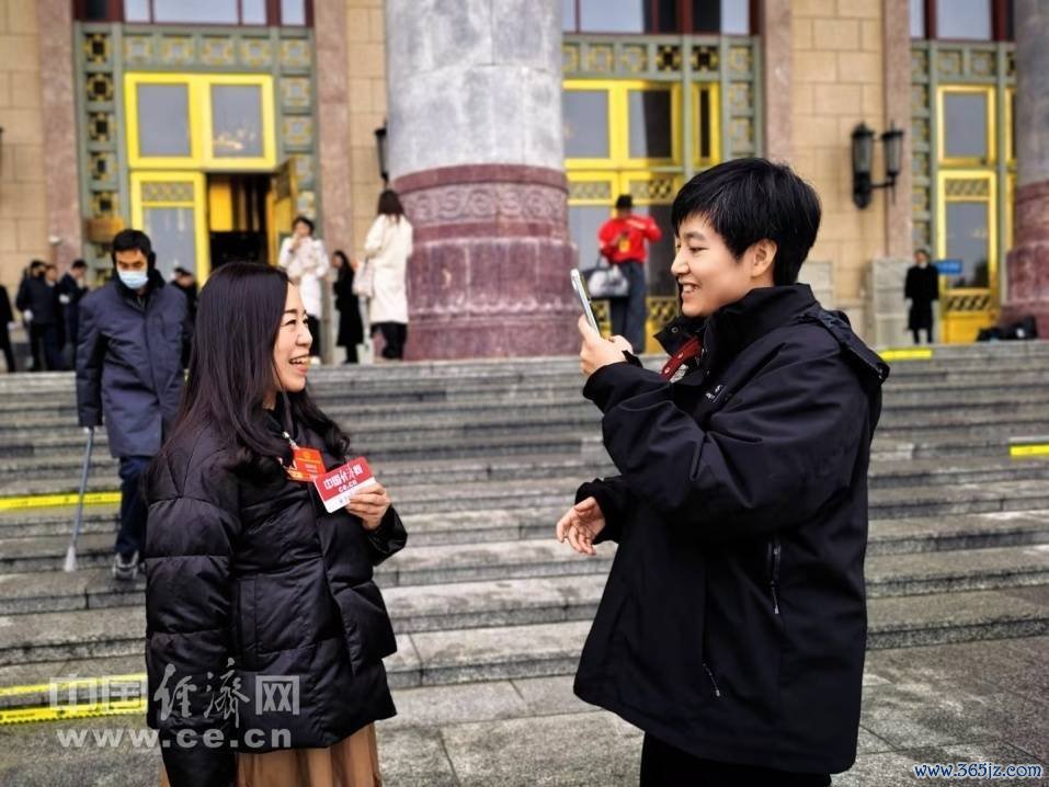 3月5日,十四届全国人大四次会议开幕。中国经济网记者李月华(右一)在人民大会堂外采访港区全国人大代表凌友诗。正值“三八”国际妇女节之际,凌友诗祝全国女性同胞节日快乐。中国经济网记者马常艳摄