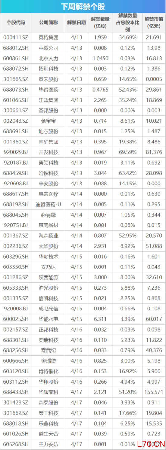 Wind数据统计显示,下周(4月13日-4月17日)共有40家公司限售股陆续解禁,合计解禁28.91亿股,按4月10日收盘价计算,解禁总市值为676.24亿元。