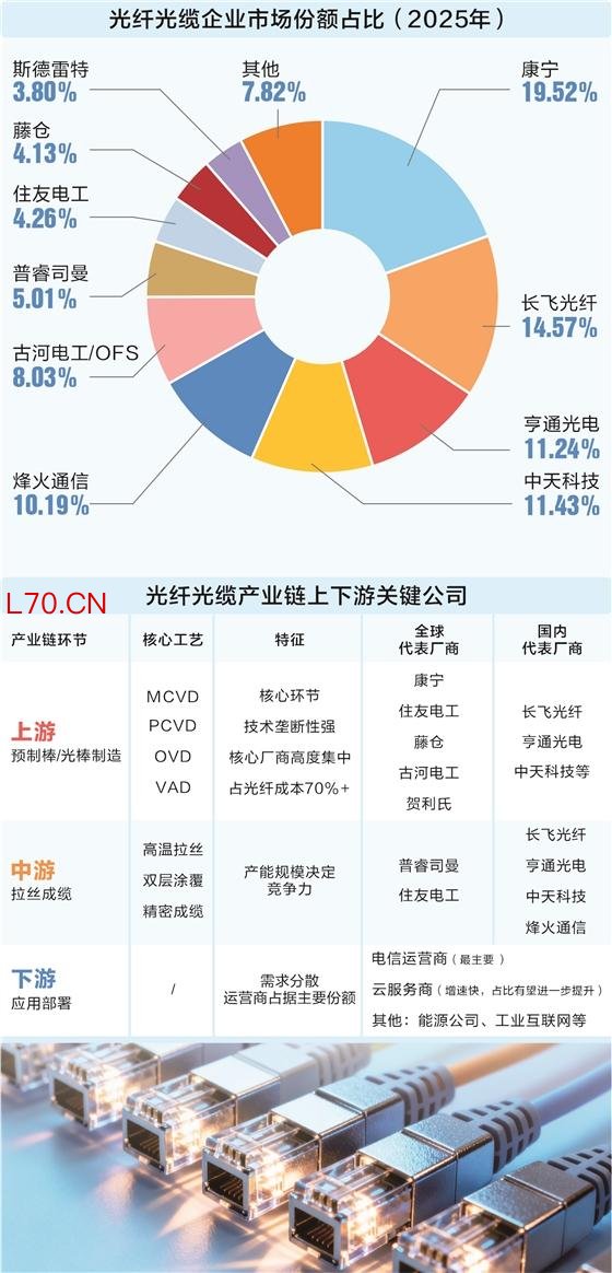 “在光纤通信全产业链中,我们最看好上游光棒与石英原材料、中游高端光纤光缆、下游光芯片与光模块这三个环节。三者确定性最强、增长持续性最久,整体高景气至少延续至2027年底,部分高端技术环节可持续至2030年。”韩林称。